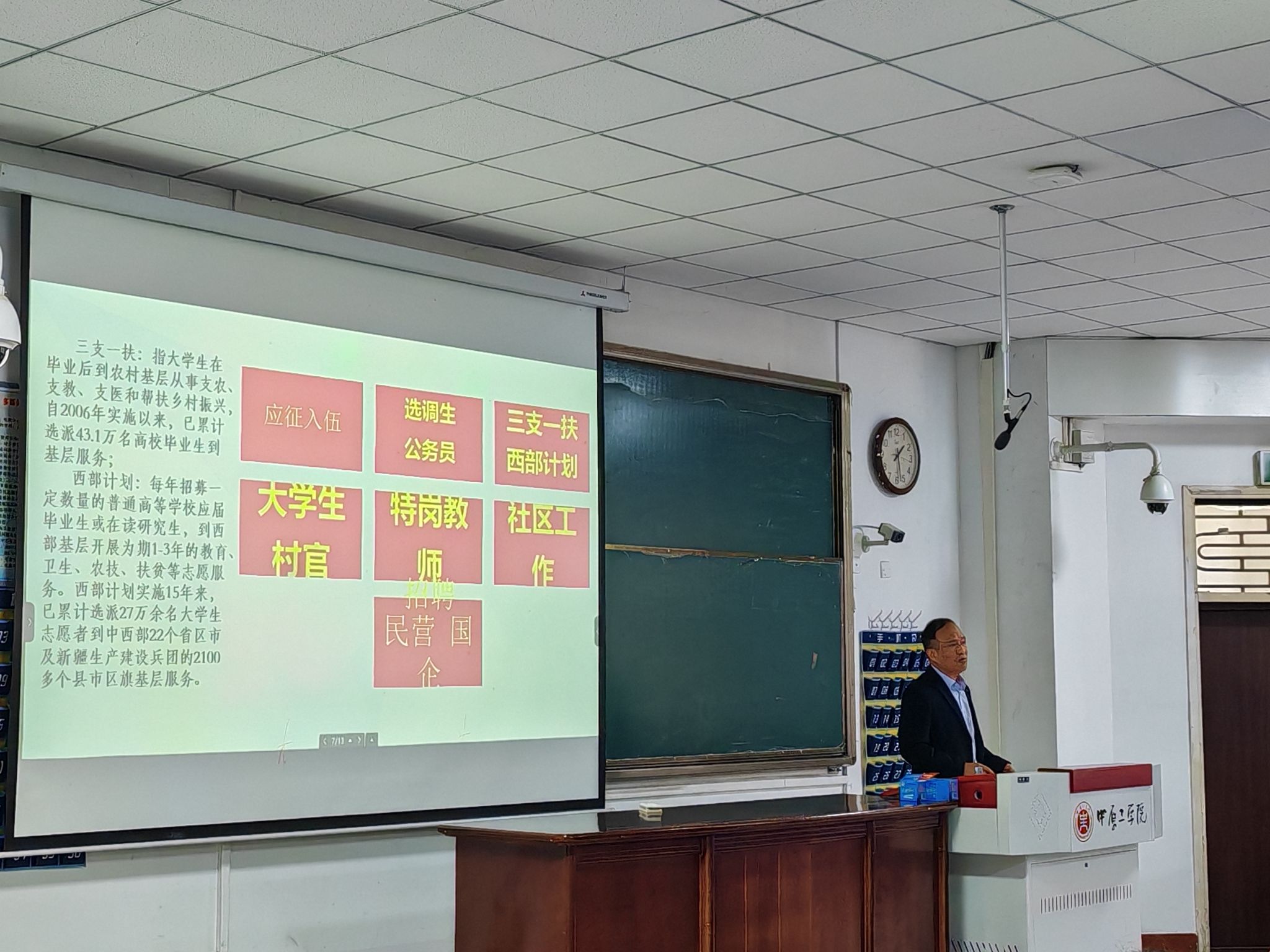 最后,杨方超详细介绍了三支一扶、西部计划、选调生、公务员、社区服务、特岗教师和征兵入伍等大学生就业优惠政策。