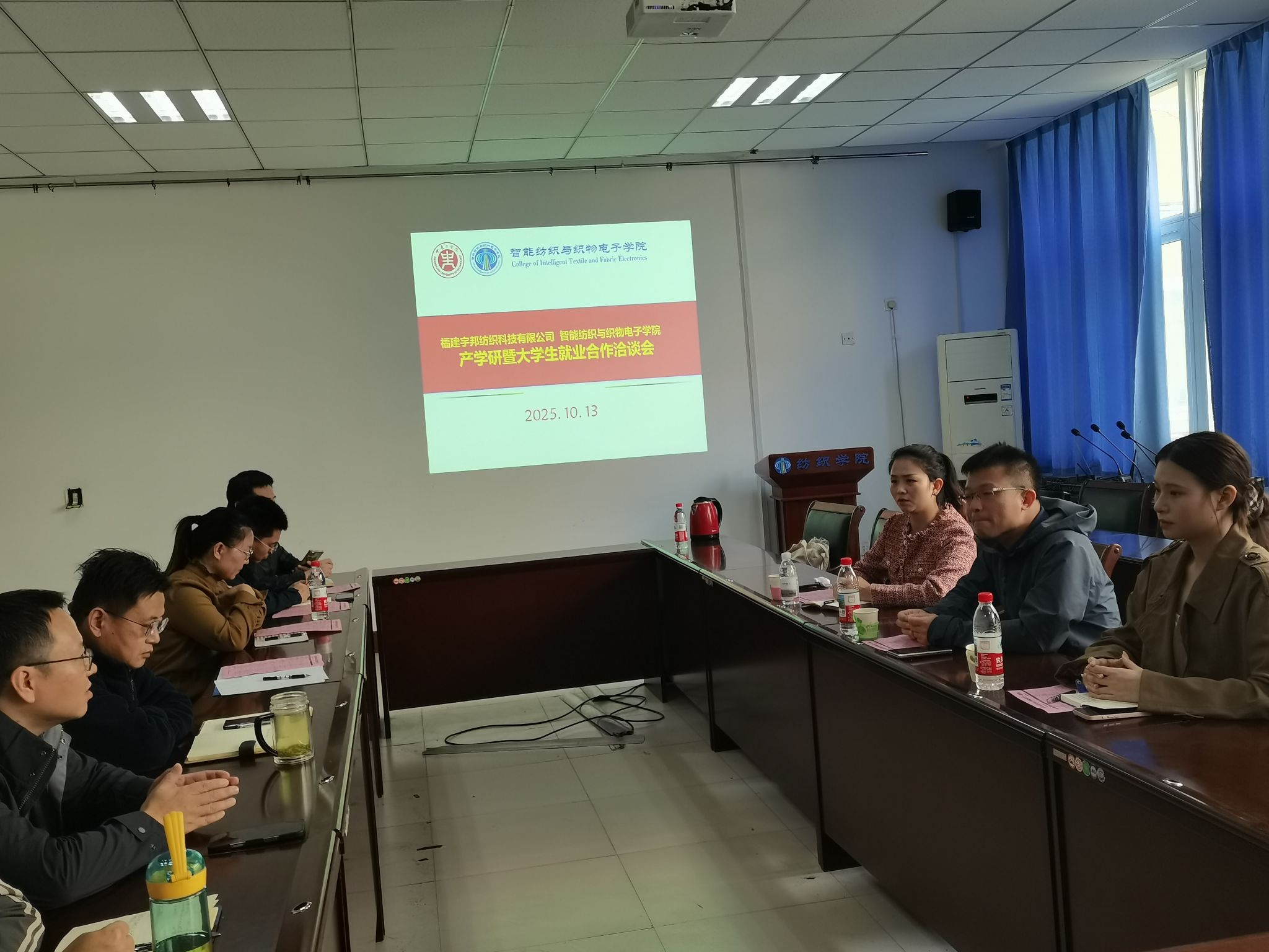 10月13日,ok138太阳集团与福建宇邦纺织科技有限公司在我校龙湖校区二号组团C座202会议室举行“产学研暨大学生就业合作洽谈座谈会”,旨在加强校企双方在纺织行业领域的沟通与合作,助力纺织类毕业生高质量就业。公司高层管理及人力资源领导,学院的相关领导、教授和博士教师代表参加了洽谈会。